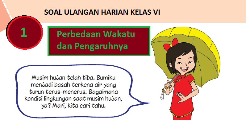 Soal Ulangan Harian Kelas 6 Tema 8 Subtema 1 Perbedaan Wakatu dan Pengaruhnya ini kami buat dengan merujuk kepada buku yang dikeluarkan oleh Kemendikbud yaitu Buku Tematik Kelas 6 Tema 8 Bumiku. Kami harapakn dengan mengacu kesana soal yang kami buat bisa sesuai dengan Kopetensi Dasar (KD) yang harus dikuasai siswa. Kami harapak soal ini bisa jadi menguji sejauhmana anak telah menuntaskan materi yang disampaikan oleh guru.